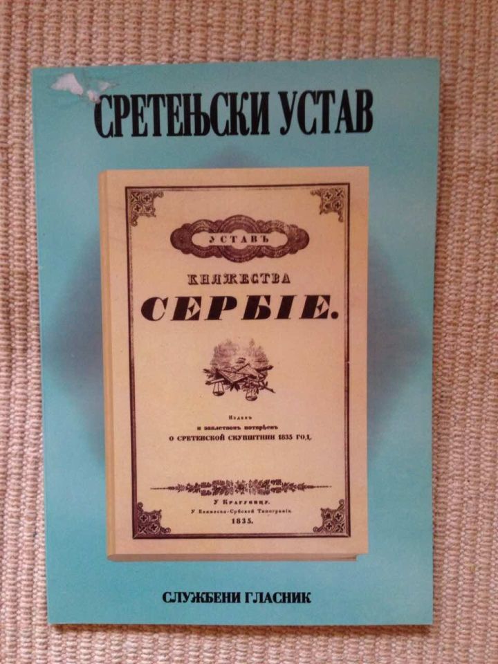 У Крагујевцу 1835. године усвојен је и заклетвом потврђен први, модерни и за то време изузетно либералан Устав Кнежевине Србије. Творац овог Сретењског устава био је новинар, политичар и дипломата Димитрије Давидовић. Њиме је у Србији укинут феудализам, међу првима у Европи.